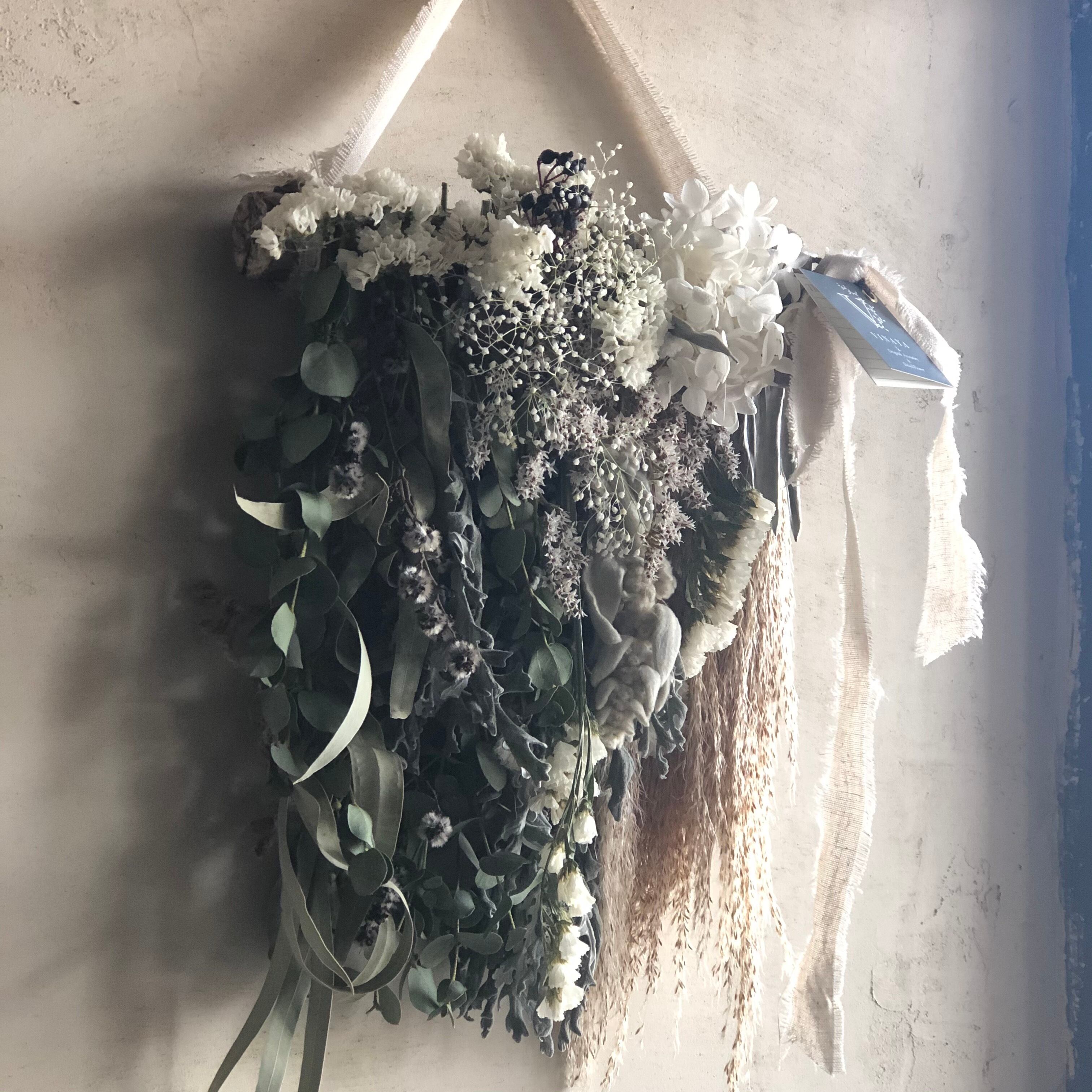 花材:ユーカリ、ダスティミラー、スターチス、テールリード、かすみ草、アジサイなど
