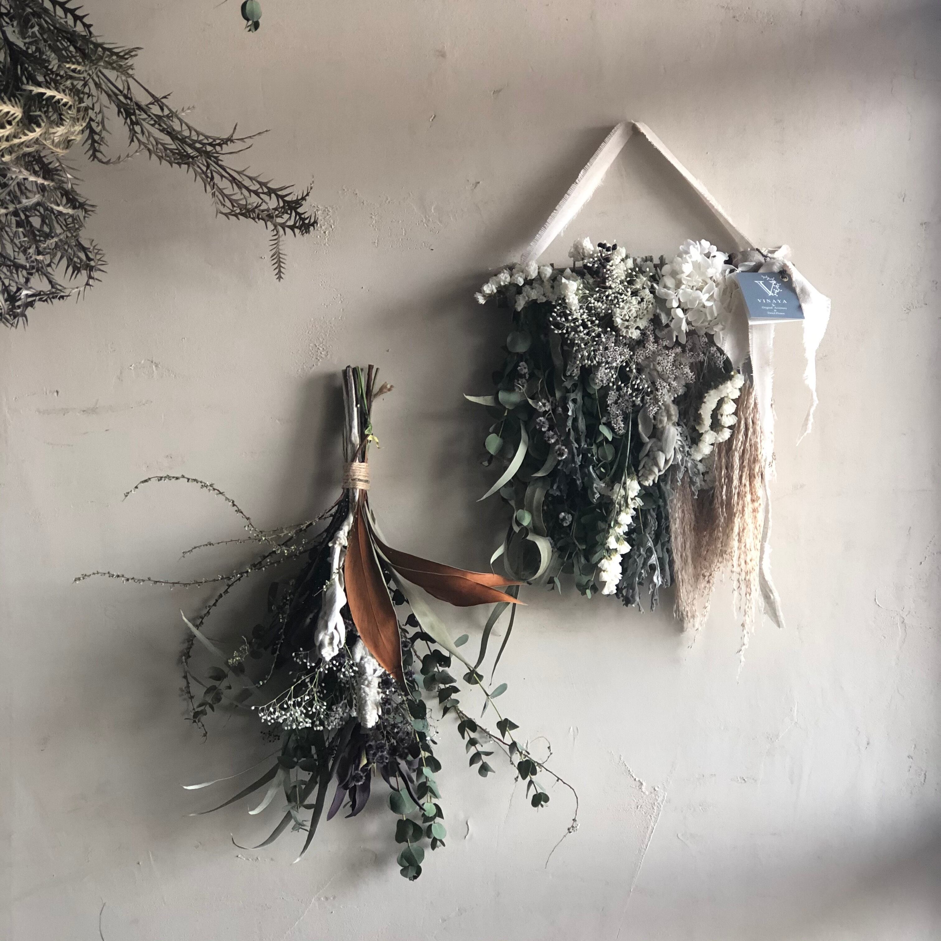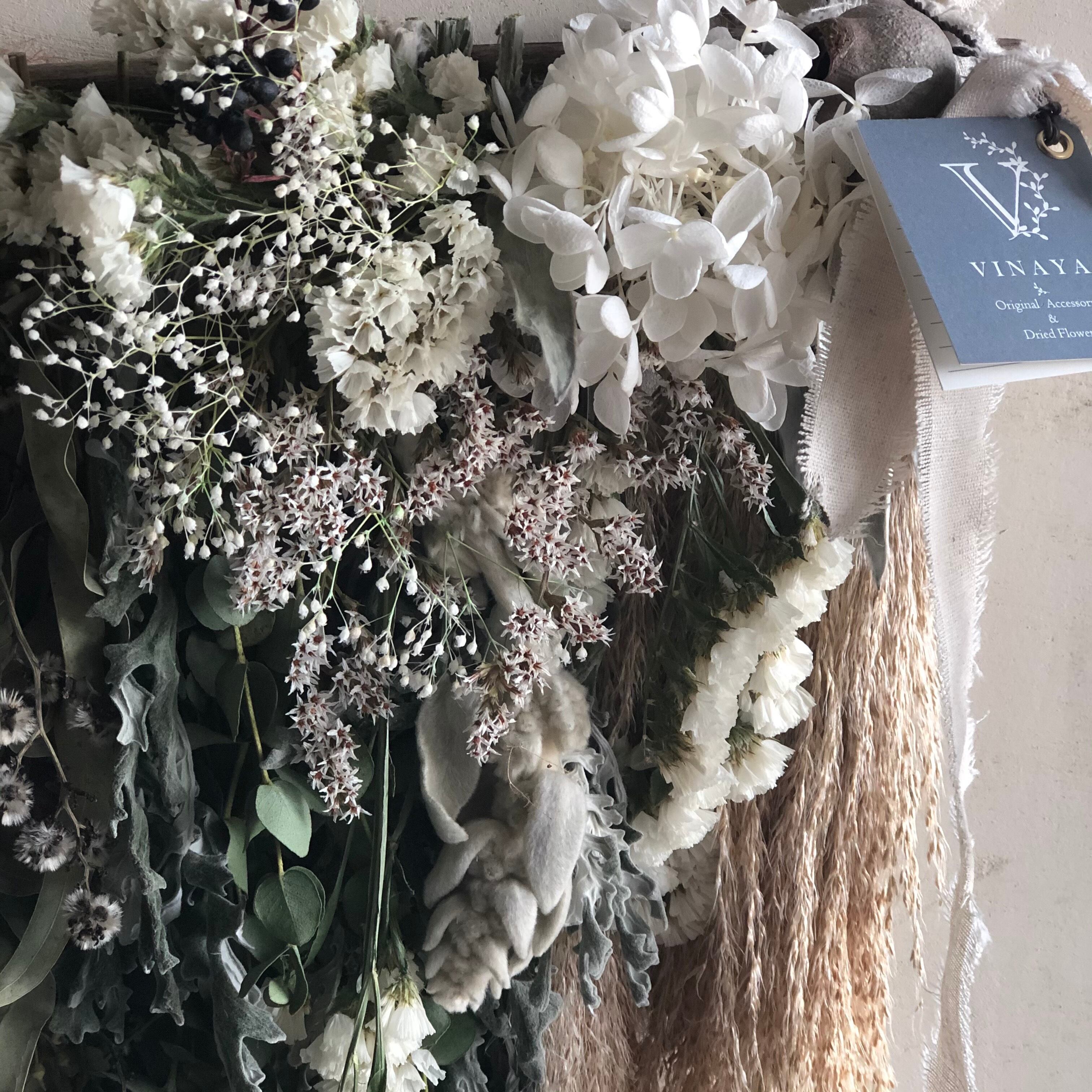 多種類のユーカリとアジサイやスターチス、かすみ草のホワイト系花々のコントラストが人気の配色です。新築祝い等のギフトやご自宅用どちらにも最適です。
