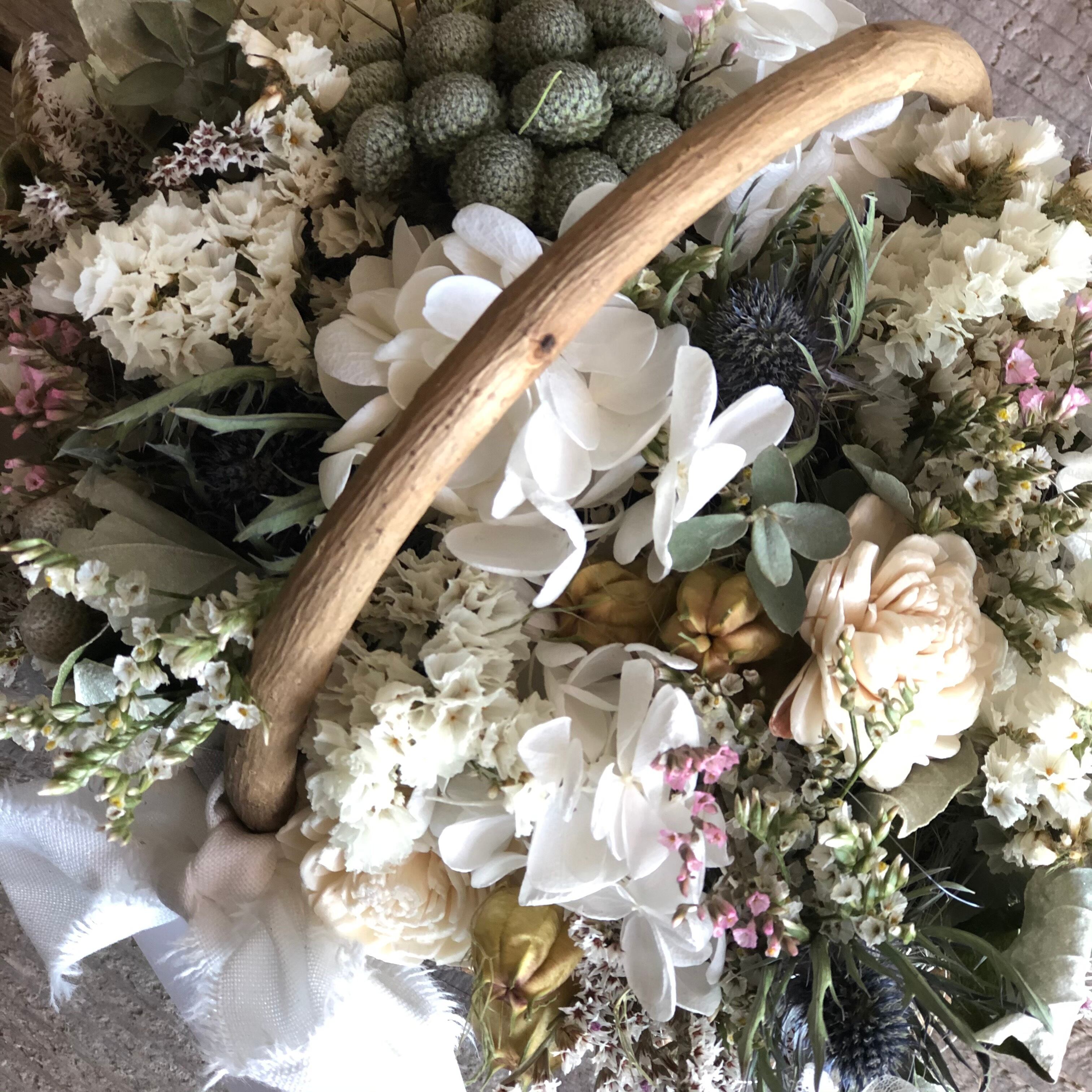 コロンとしたかごにドライフラワーをたっぷりアレンジメント。