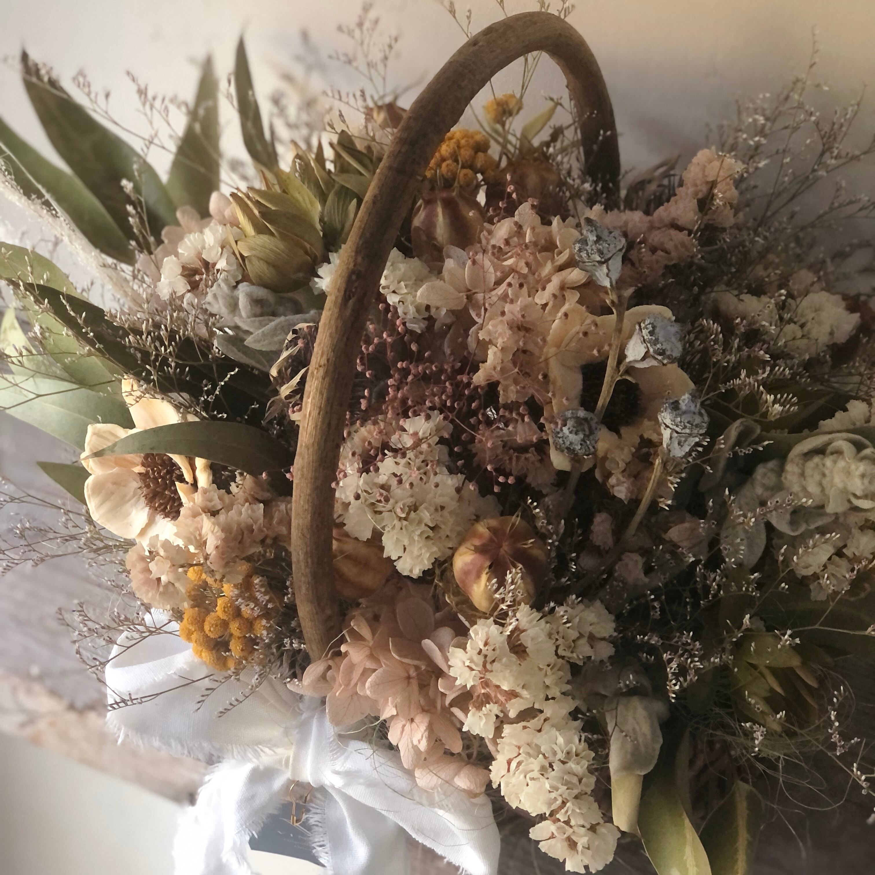 ユーカリ、パインフラワー、スターチス、かすみ草、アジサイ、エリンジウムなど